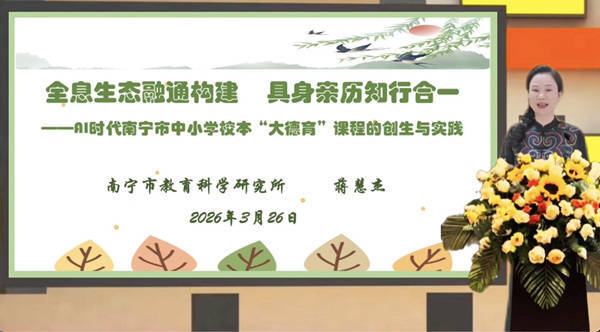 活动开篇,南宁市教育科学研究所德育教研员蒋慧杰老师以数字人形象云端亮相,带来题为《全息生态融通构建,具身亲历知行合一——AI时代南宁市中小学校本德育课程的创生与实践》的专题分享。