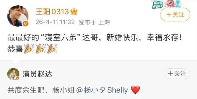 演员王阳发文,祝福昔日“寝室六弟”赵达步入婚姻殿堂,兄弟情谊满满。